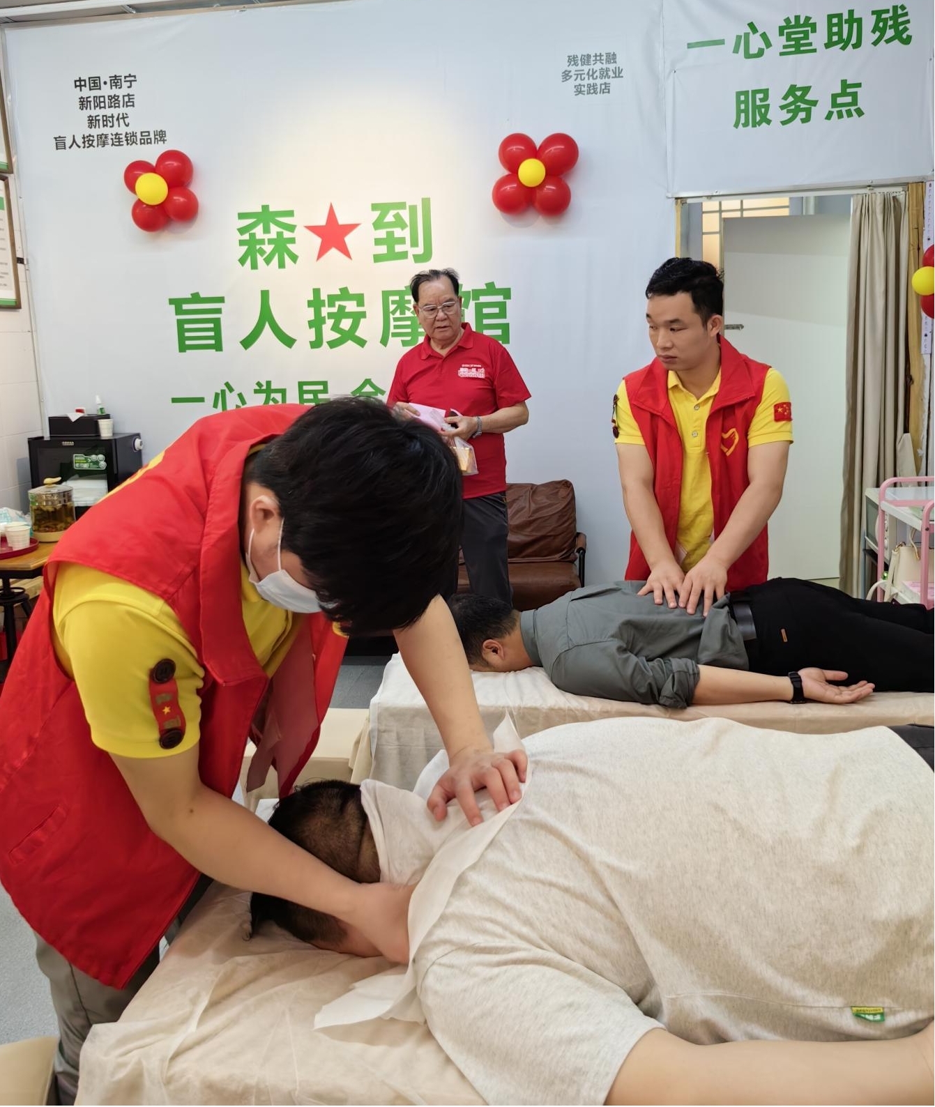 2025年5月16日上午,新阳路237号一心堂药店门口热闹非凡,由自治区盲人按摩指导中心、广西鸿翔一心堂药业有限责任公司联合举办的“党建领航 一心助盲桂在行动”盲人按摩宣传推广暨志愿服务活动在这里举行。自治区盲人按摩指导中心主任韦永华、广西鸿翔一心堂药业有限责任公司工会主席张月萍、南宁市就业指导中心副主任万青青参加活动。