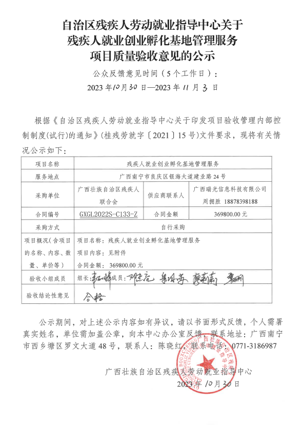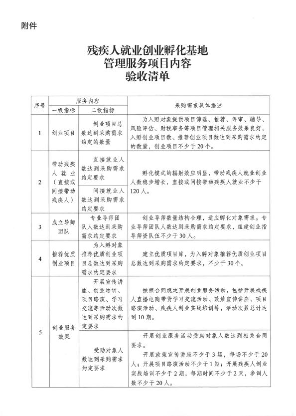 自治区残疾人劳动就业指导中心关于残疾人就业创业孵化基地管理服务项目质量验收意见的公示