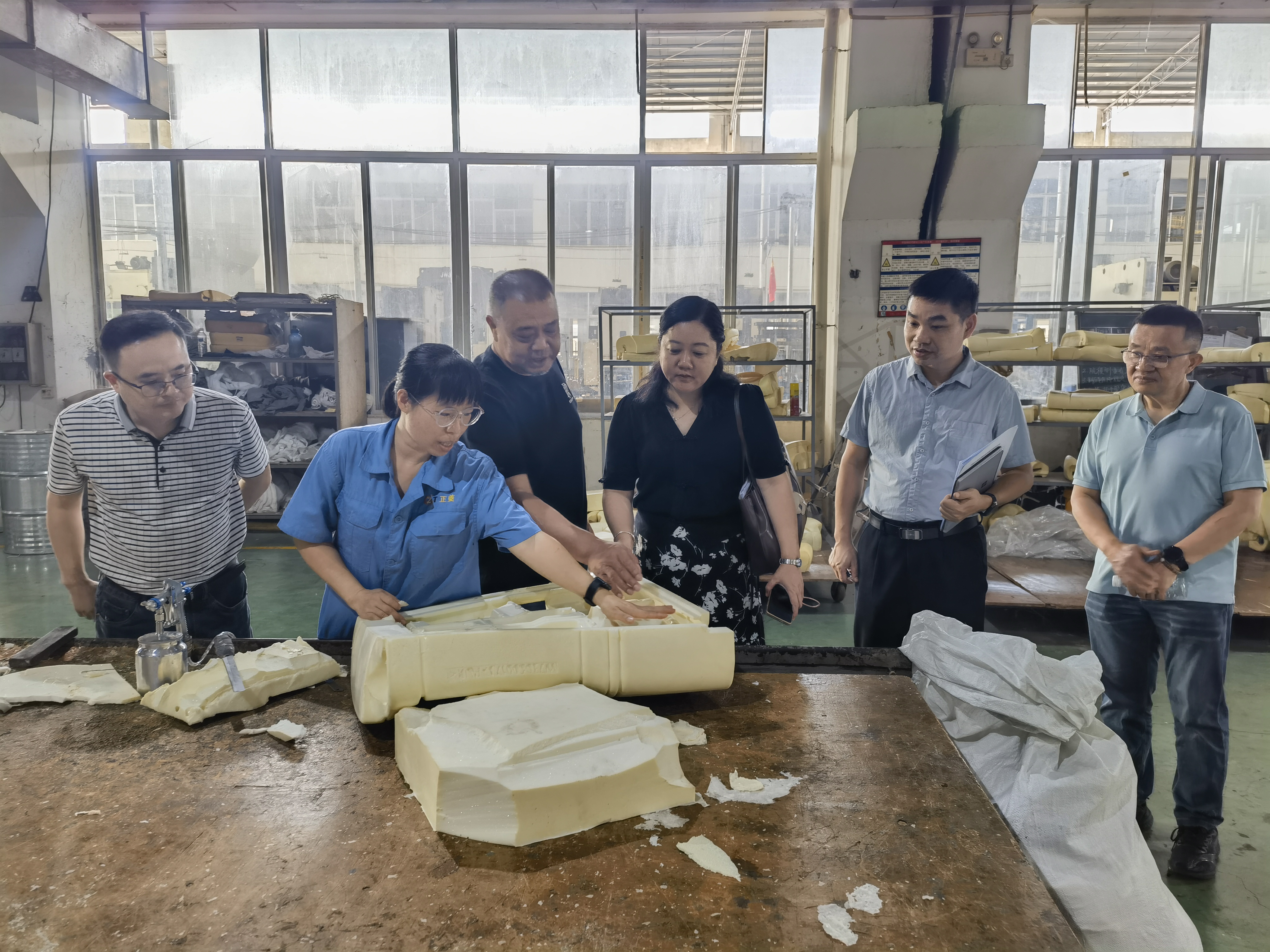 图为调研组实地考察玉林正菱汽车配件有限责任公司工厂车间