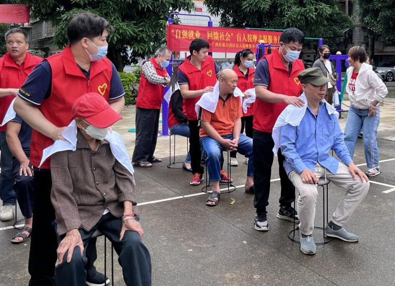 图为盲人互助志愿服务队为社区居民提供按摩服务