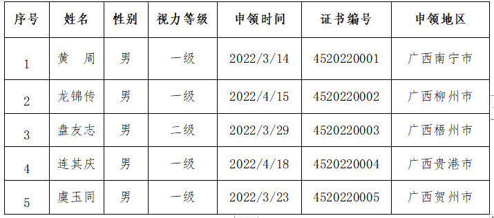 根据自治区残联、自治区卫生厅《关于印发〈广西壮族自治区盲人医疗按摩人员从事医疗按摩资格证书管理办法实施细则〉的通知》(桂残联字〔2012〕42号)和《关于做好〈盲人医疗按摩人员从事医疗按摩资格证书〉申领和年审工作的通知》(桂盲按字〔2022〕3号)精神,经各市残联初审、自治区残联复核并向社会公示,我区2022年共有5名盲人医疗按摩人员通过从事医疗按摩资格审核,获取了盲人医疗按摩人员从事医疗按摩资格证书,现将名单予以公布。请各市残联通知相关人员及时到医疗机构所在地的卫生健康或中医药管理部门进行备案,卫生健康和中医药管理部门将根据《盲人医疗按摩管理办法》及有关规定,对盲人医疗按摩人员执业行为进行管理。