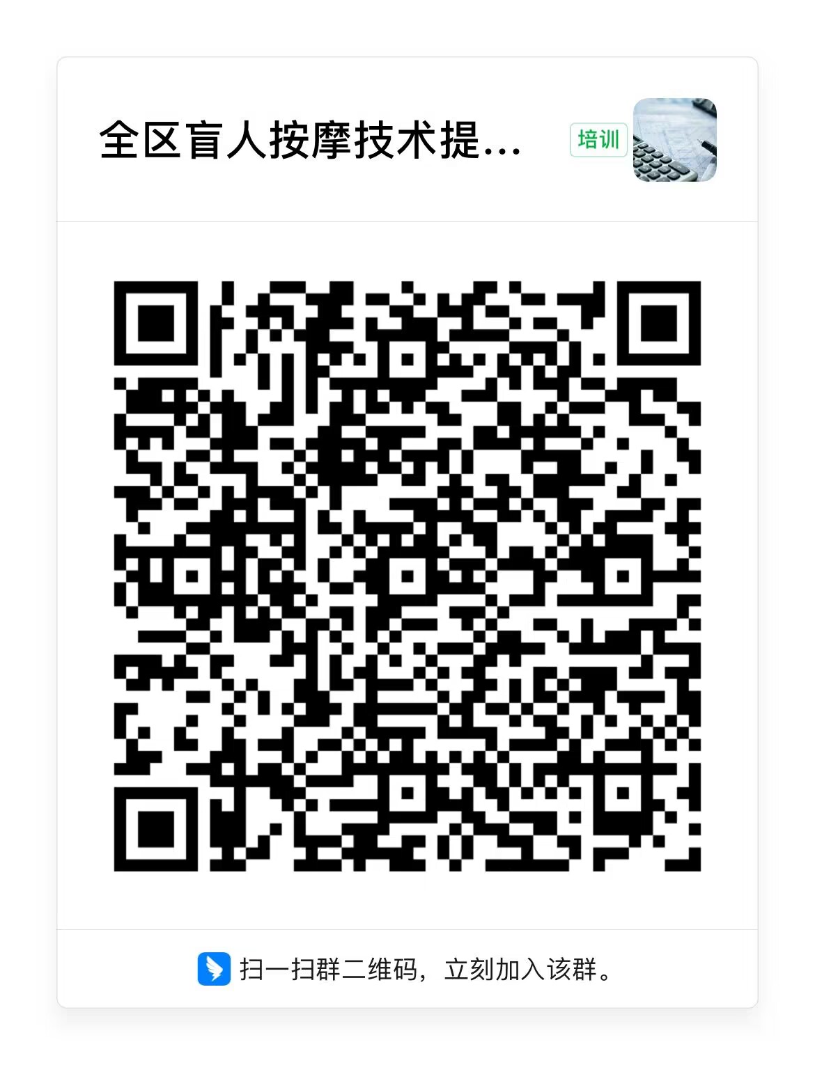 (二)添加群号“34355603”或者扫描二维码“全区盲人按摩技术提升网络培训”(附件)申请加入群组;