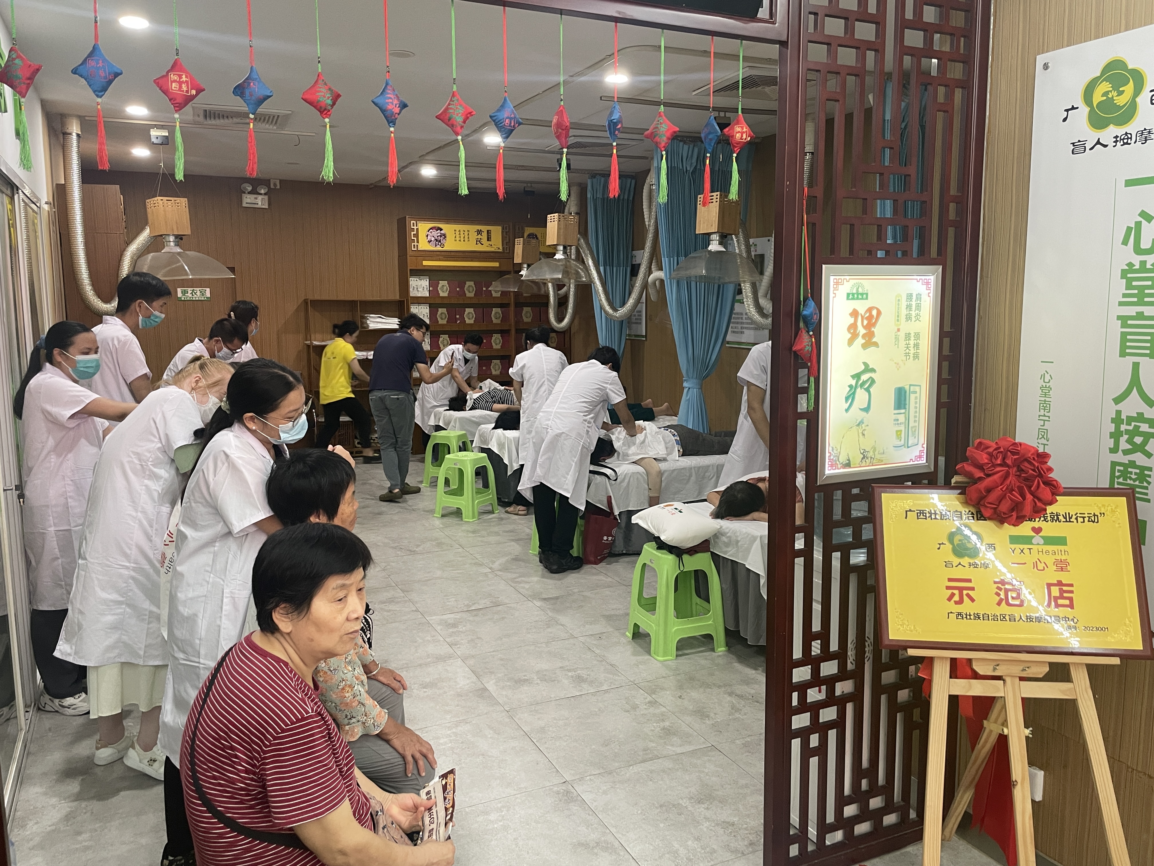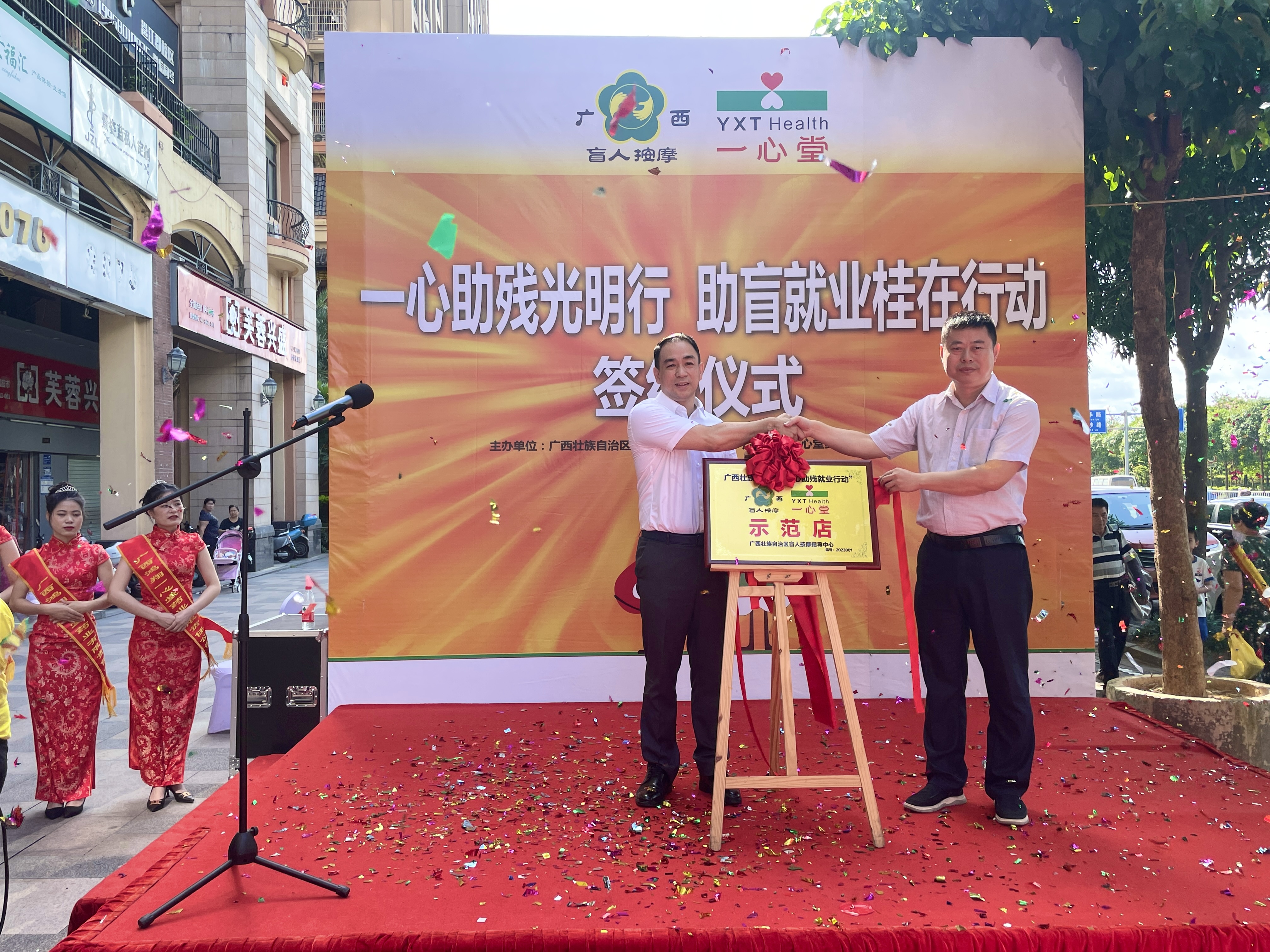 7月12日,广西“一心助残光明行,助盲就业桂在行动”项目启动仪式在南宁市凤江路6号一心堂大健康药店举行。自治区残联教就部副主任方乾林、自治区盲人按摩指导中心主任韦永华、副主任班革、广西鸿翔一心堂药业有限责任公司总经理彭彦及南宁市残疾人劳动就业服务指导中心业务负责人、部分盲人按摩师代表参加了启动仪式。
