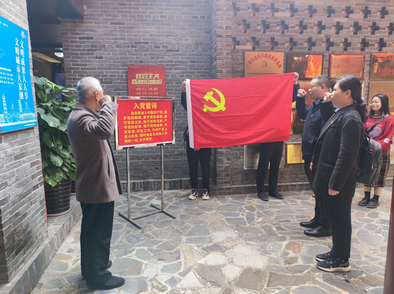 参观结束后,支部书记韦永华给大家分享了自己的所思所感。接着,班革、黄辉两位过政治生日的同志也分别发表了自己的参观感言。最后,支部书记韦永华代表党支部给两位同志送上生日贺卡和“政治生日”祝福,并带领他们再一次重温入党誓词。