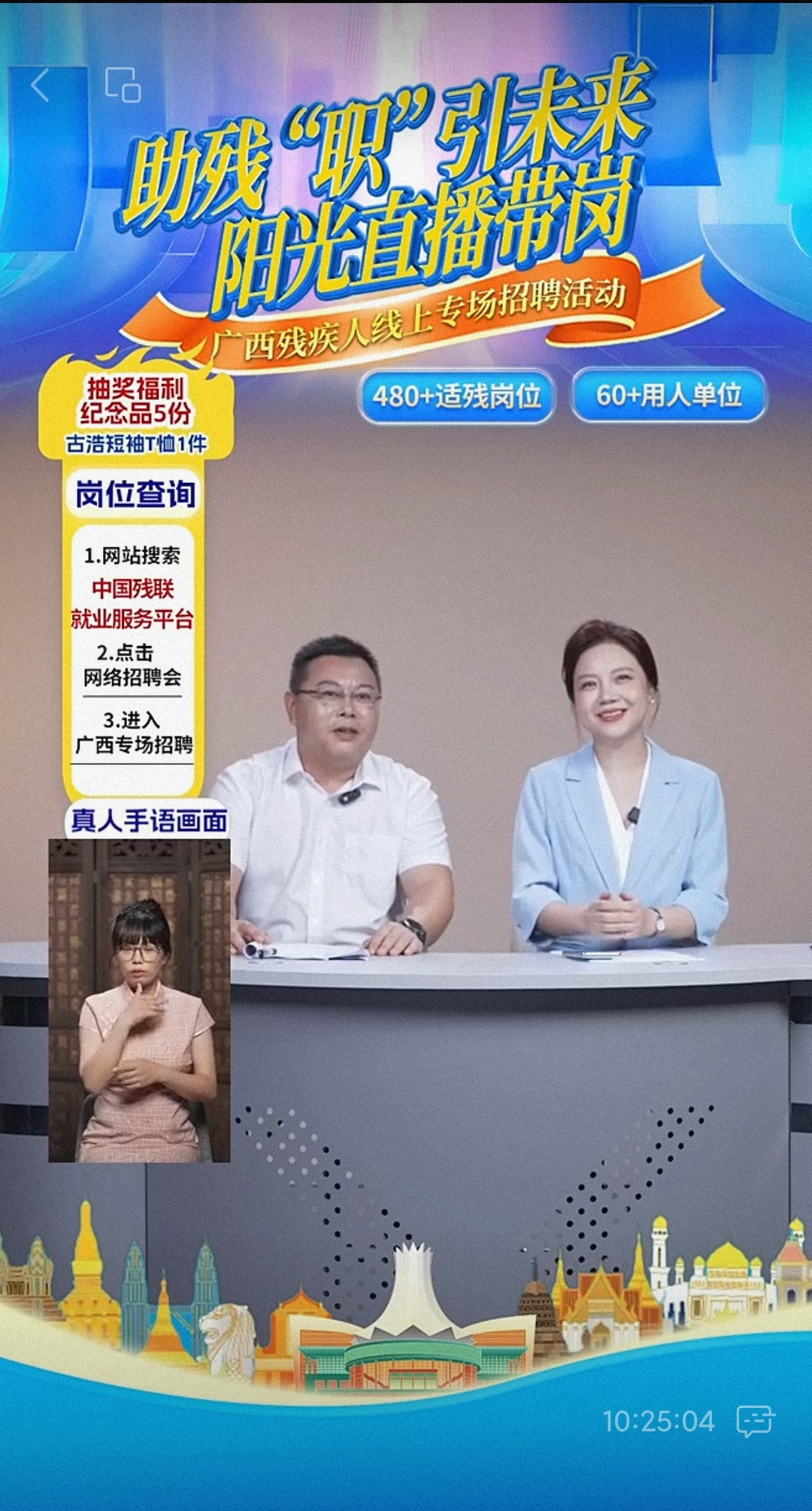 2025年9月29日,由自治区残疾人劳动就业指导中心与广西影视频道联合主办的“助残‘职’引未来 阳光直播带岗”广西残疾人线上专场招聘活动第三场顺利开播,为残疾人求职者与用人单位搭建起高效对接桥梁。
