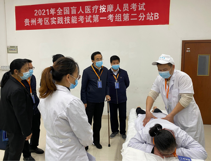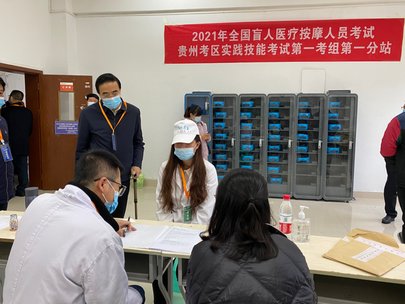 全国盲人医疗按摩人员考试是国家医学考试的重要组成部分,考试采取全国统一大纲、统一命题、统一组织的方式,分为综合理论和实践技能操作两部分,其中,实践技能操作又包括推拿手法诊疗和经络穴位点位。此次考试,中国残联领导高度重视,中国残联党组成员、主席团副主席、副理事长程凯亲临贵州区域性考试中心考场进行巡考、检查疫情防控工作。他对考场设施进行了认真检查,询问防疫物资的准备情况,检查考场的考风考纪。期间,他还专门看望了在考场外待考的广西考生蓝旭番和韦艳来,询问了他们的考前准备情况,鼓励他们沉着应对考试,努力考取好成绩。