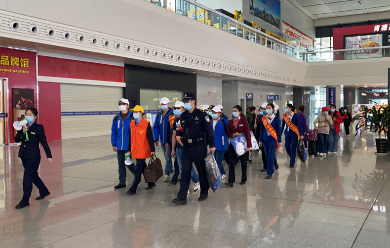 图为南宁东站的“红三角党建联盟”服务队引导广西考生进站