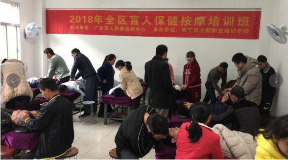 为了深入贯彻落实习近平总书记关于贫困残疾人脱贫攻坚的重要指示精神,贯彻落实自治区残联、财政厅、人力资源社会保障厅、扶贫办共同印发的《广西壮族自治区助盲就业脱贫行动实施方案》,进一步加大对贫困残疾人中更为困难的视力残疾人的技能培训和就业扶持力度,加快推动贫困视力残疾人实现就业脱贫,2018年12月12日,自治区盲人按摩指导中心通过政府购买方式委托南宁市士熙职业培训学校在南宁市开办了首期全区“助盲就业脱贫行动”盲人保健按摩培训班。
