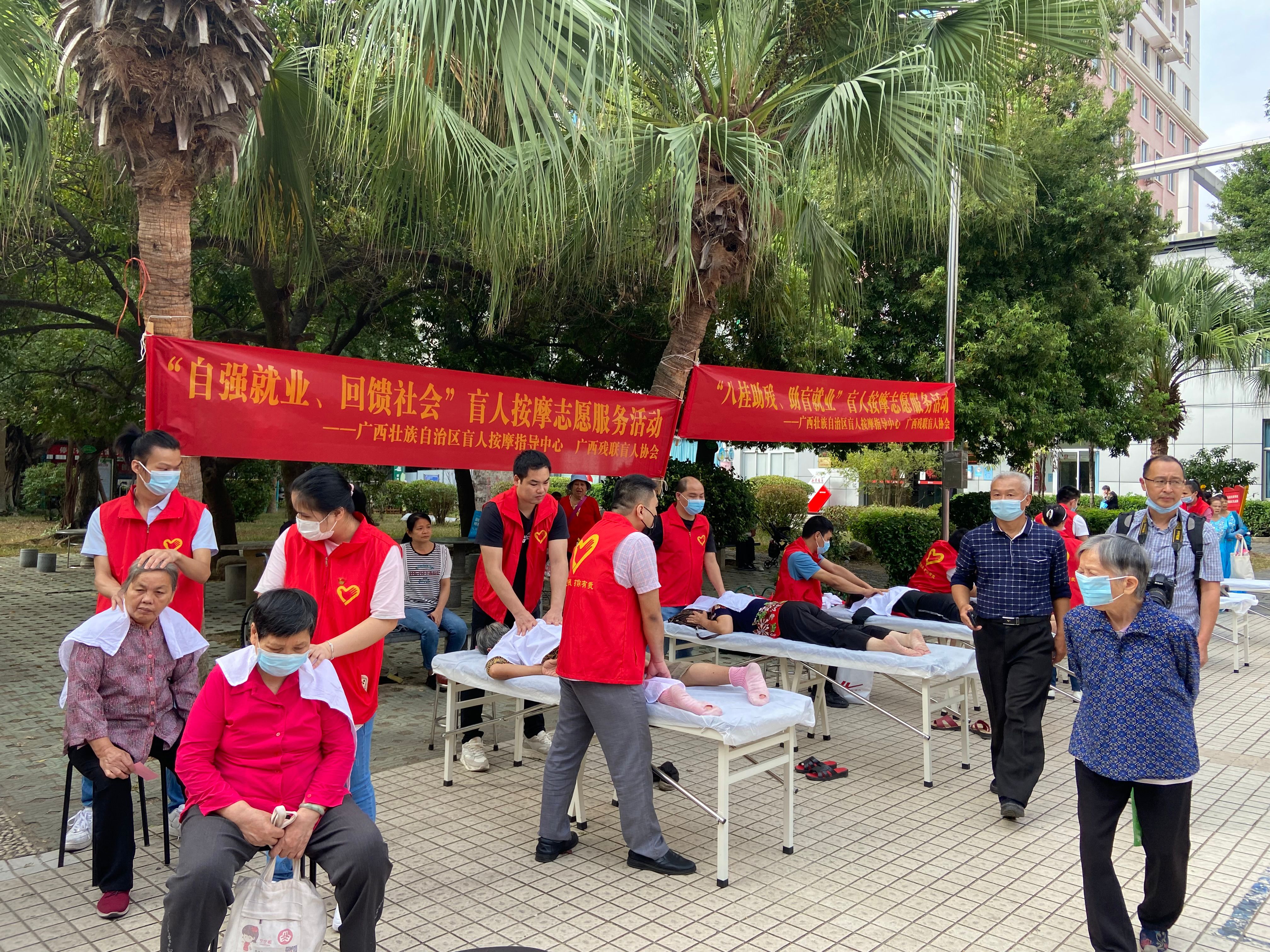 2022年11月10日,为深入学习宣传贯彻党的二十大精神,结合11月主题党日活动,自治区盲人按摩指导中心组织新思路盲人按摩店的15名盲人技师组成志愿服务队走进南宁市青秀区新竹社区,开展宣传党的二十大精神盲人按摩志愿者进社区服务活动,为居民们送去温暖,推动新时代文明实践走深走实。