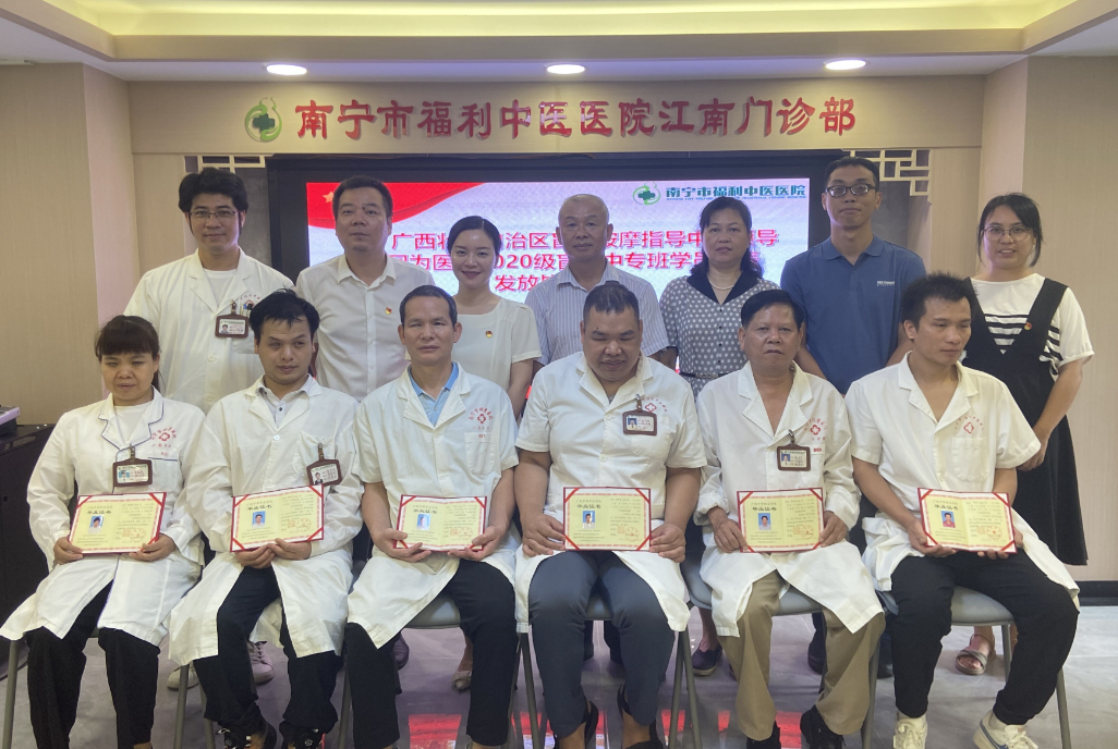 接着,双方支部的党员与南宁市福利中医医院江南门诊部2020级盲人中专班学员代表进行座谈,征求他们对我区盲人按摩工作的意见和建议,自治区盲人按摩指导中心党支部书记韦永华鼓励他们加强学习,不断进步,将自己学到的知识和技术运用到今后的实际工作中,回馈社会,帮助更多有需要的人。最后,盲人按摩指导中心党支部领导班子向2020级盲人中专班的学员颁发了毕业证书,并与他们合影留念。