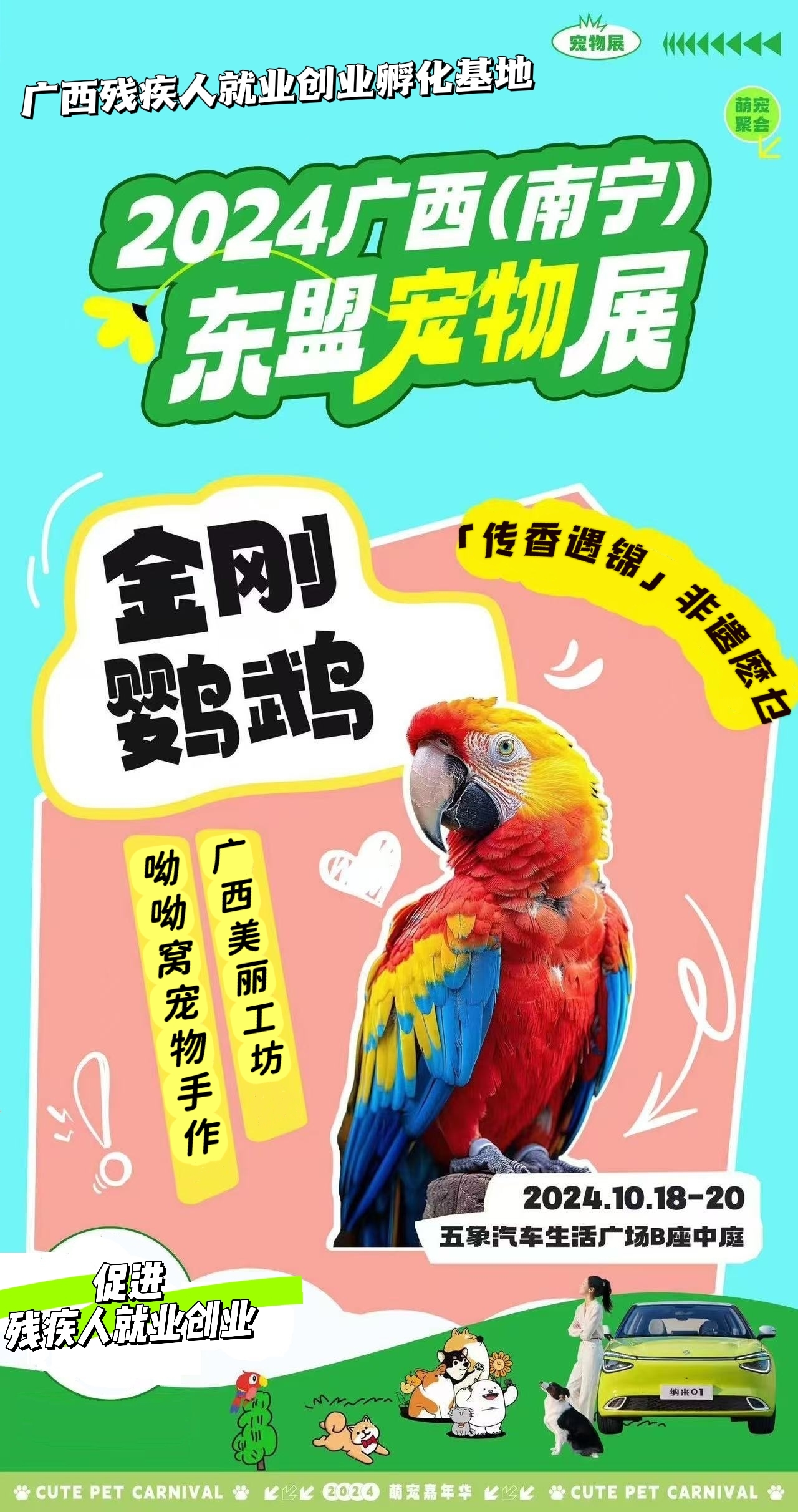 应2024广西(南宁)东盟宠物展主办方邀请,广西残疾人就业创业孵化基地孵化的企业——“传香遇锦”非遗麽乜创新设计、哟哟窝宠物手作,广西美丽工坊——广西南宁市壮锦印象文化艺术有限公司等3家助残就业企业获邀参展。