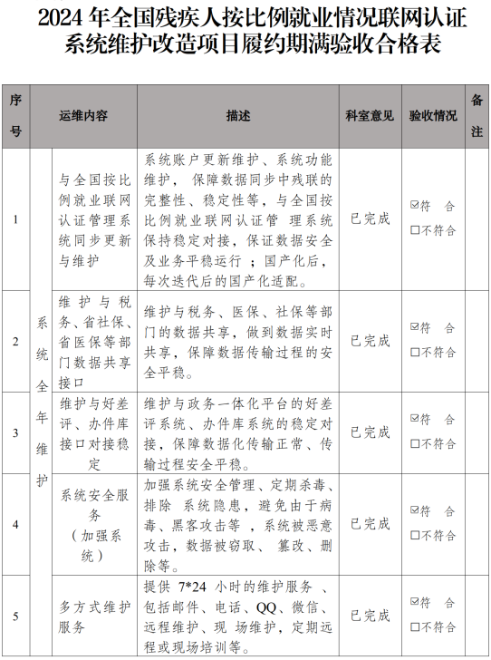 附件:2024年全国残疾人按比例就业情况联网认证系统维护改造项目履约期满验收合格表