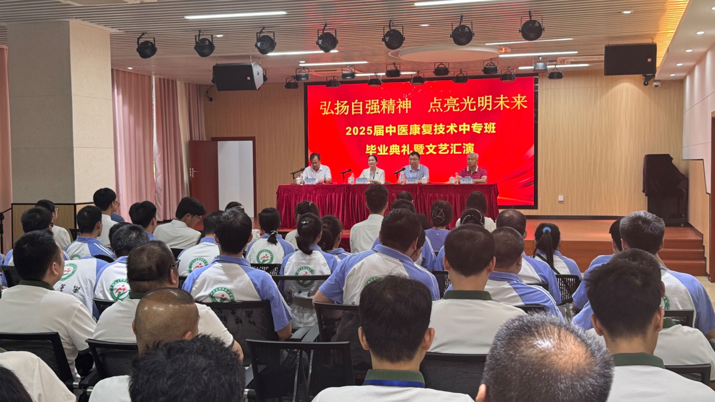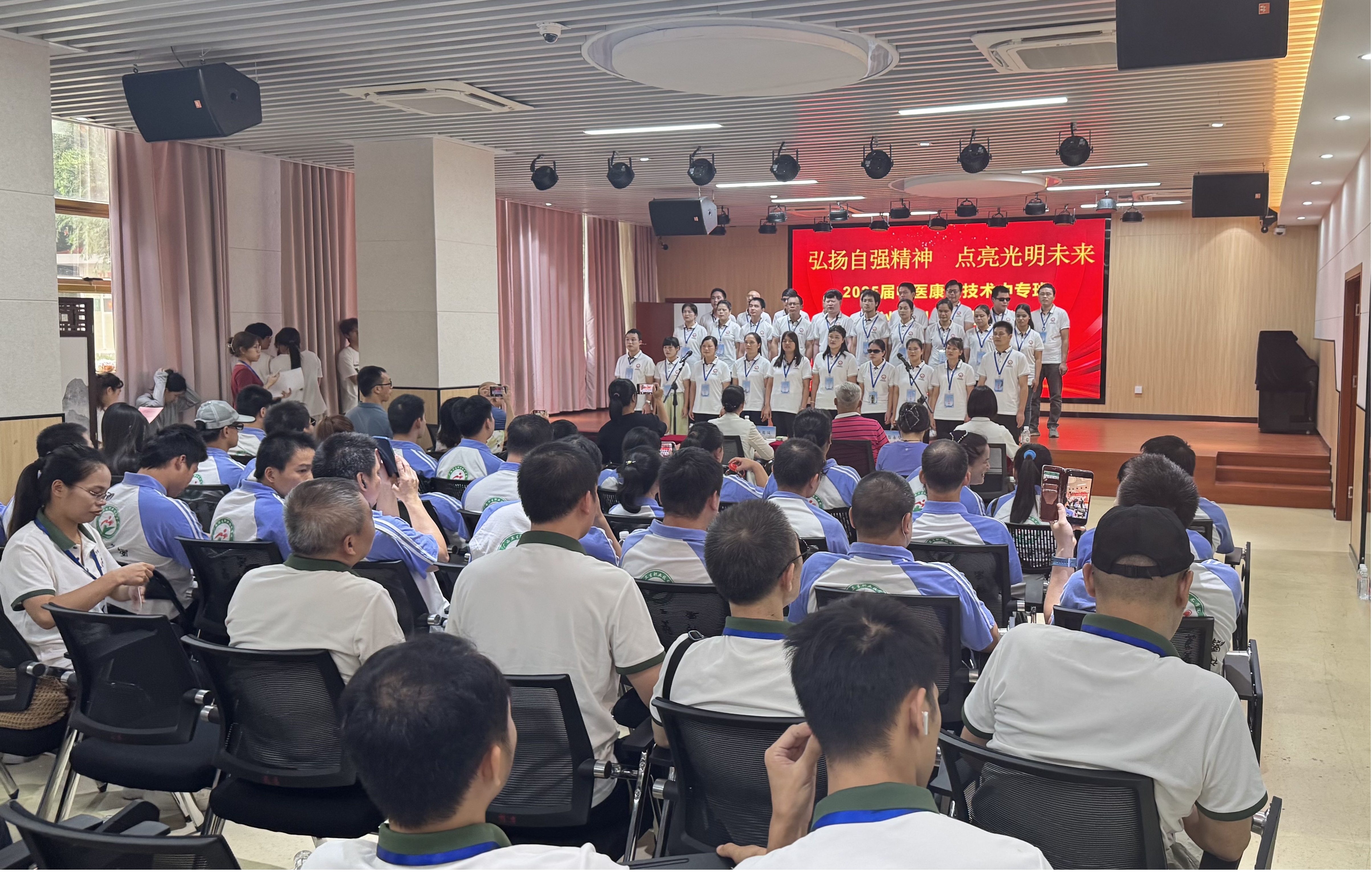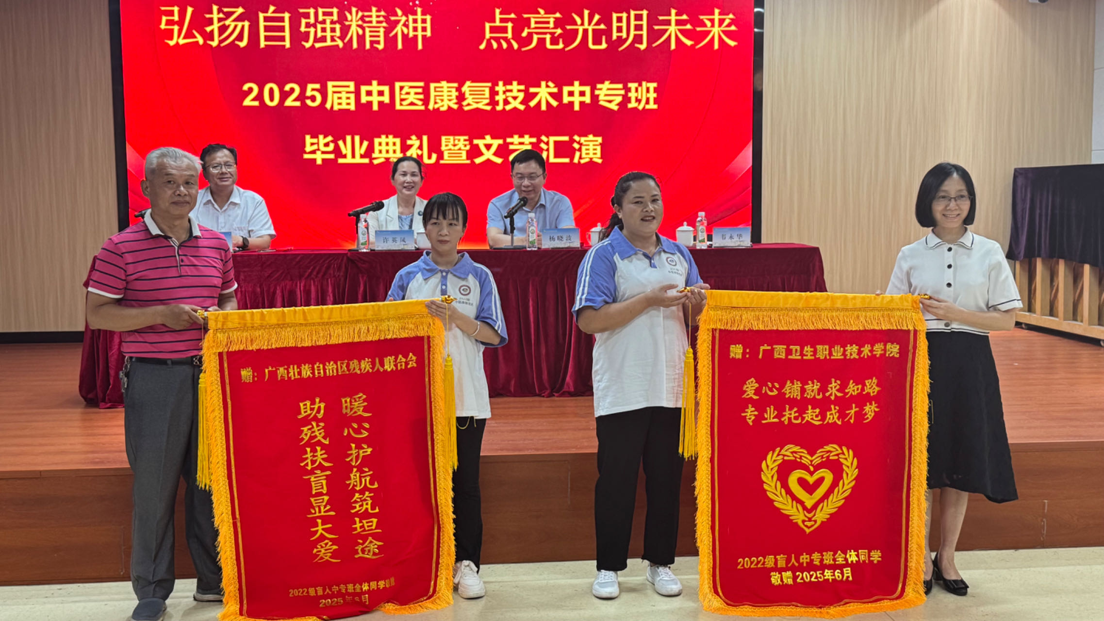 2025年6月26日下午,“弘扬自强精神 点亮光明未来”2025届中医康复技术专业盲人中专班毕业典礼暨文艺汇演在广西卫生职业技术学院昆仑校区大学生活动中心举行。自治区残联党组成员、副理事长许英凤,广西卫生职业技术学院党委副书记、校长杨晓波出席毕业典礼并讲话。自治区盲人按摩指导中心负责人、盲人中专班班主任、辅导员、部分授课老师及全体盲人中专班学生参加了活动。
